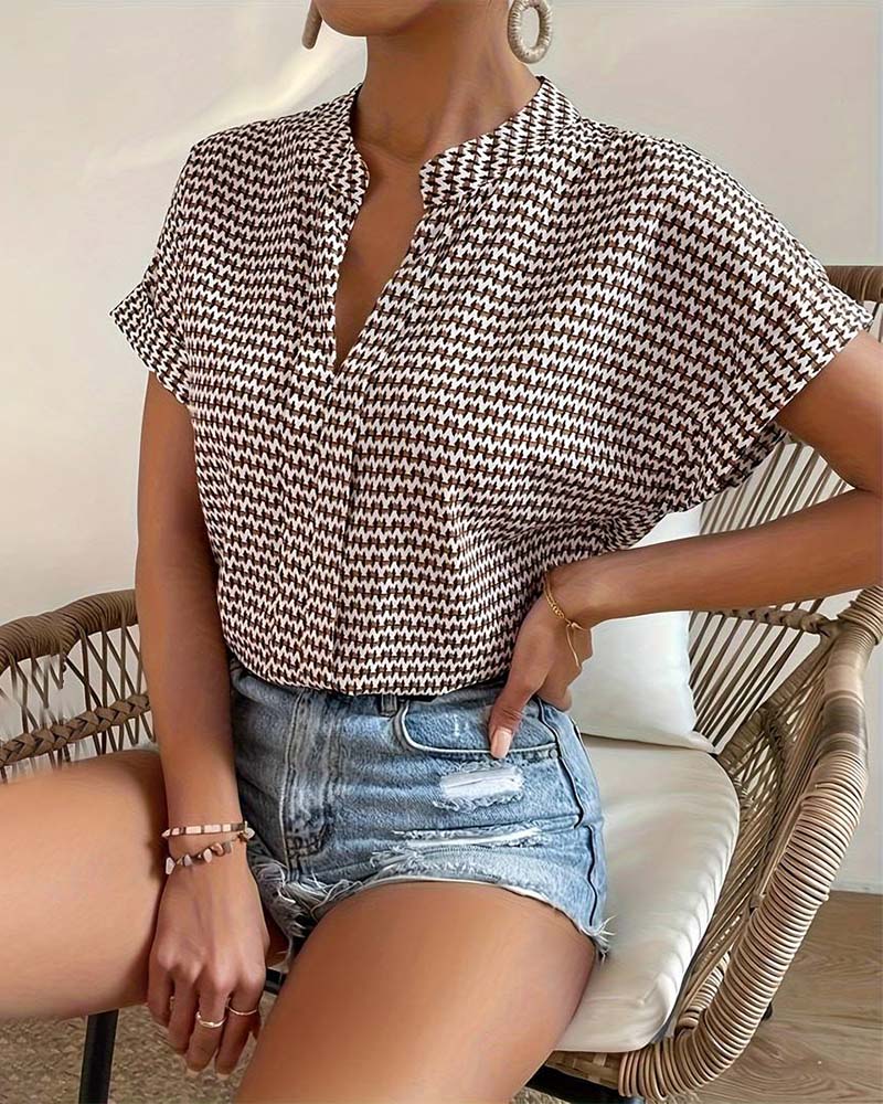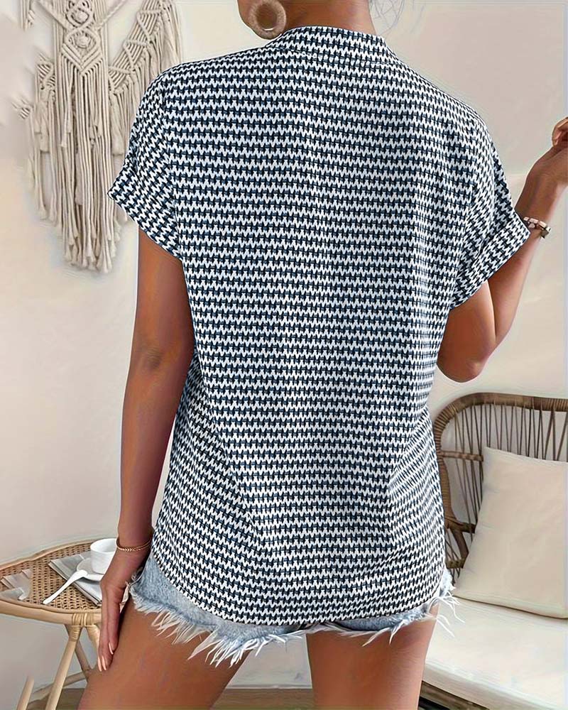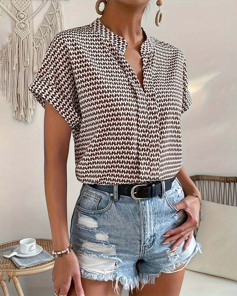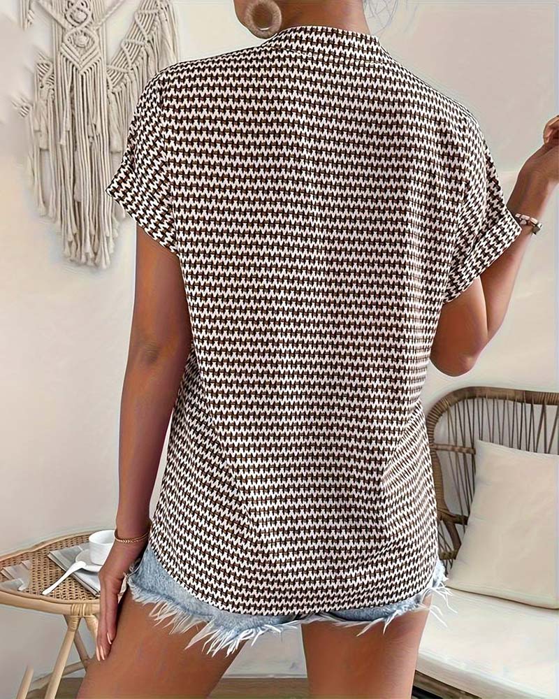 Haut élégant à manches courtes et col en V imprimé pied-de-poule
